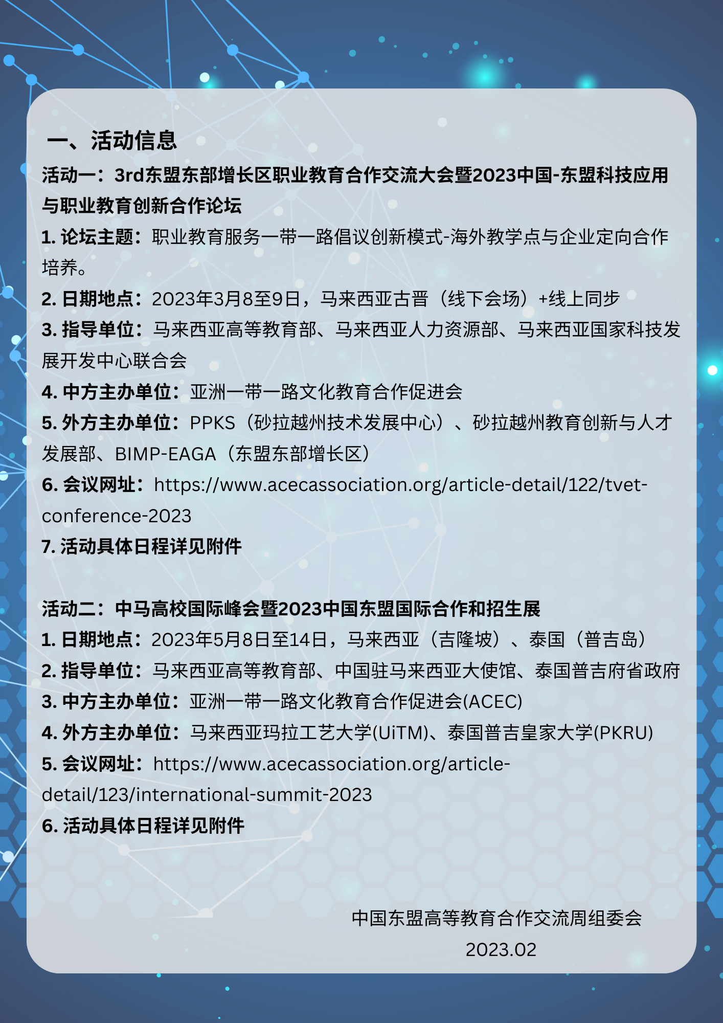 Tuesday February 07, 2023 February 07, 2023 News Info 中国-东盟高等教育合作交流周(TVET) 3rd东盟东部增长区职业教育合作交流大会和2023中国-东盟科技应用与职业教育创新合作论坛
