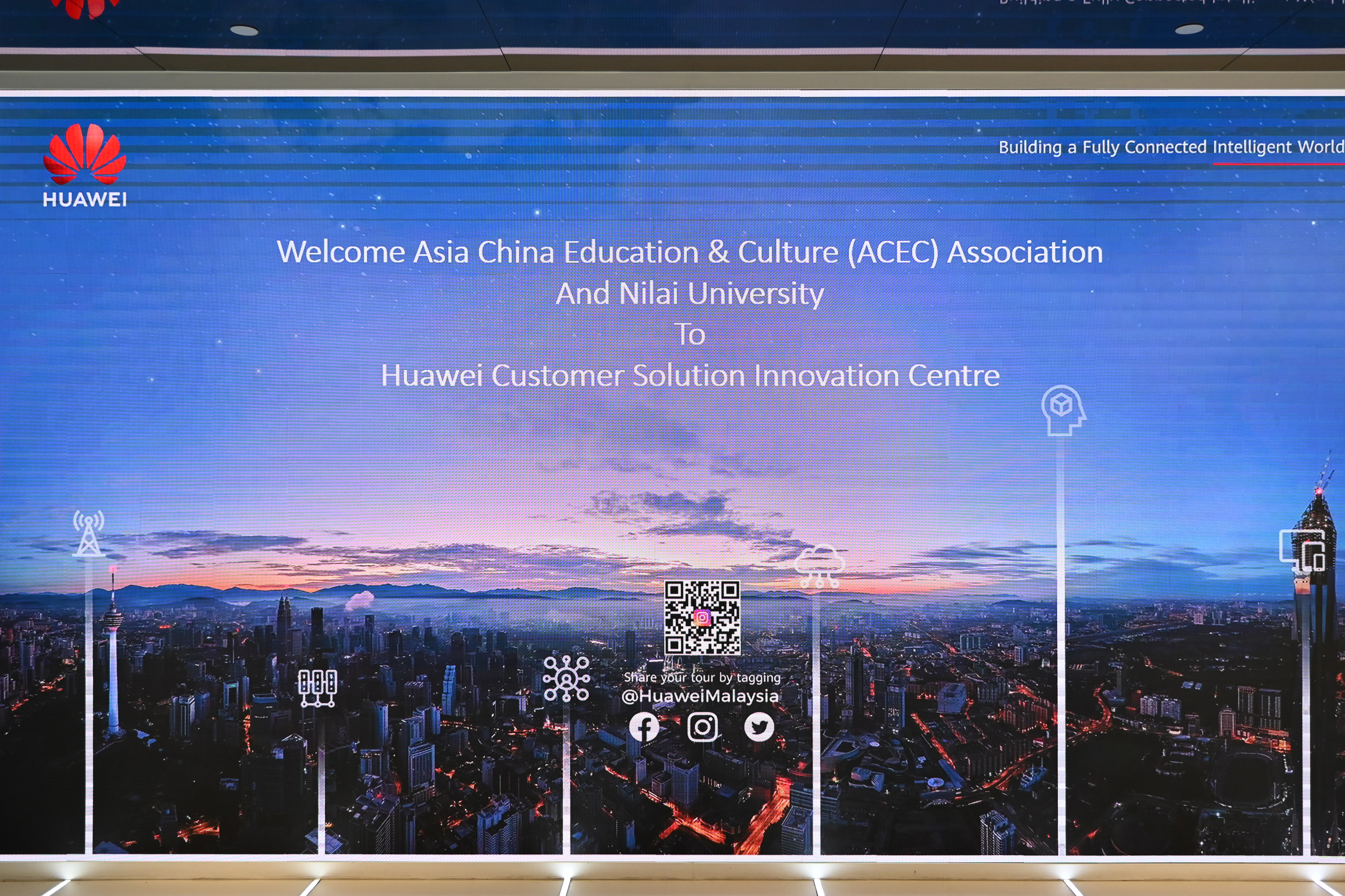 Six visiting scholars of Nilai University from Jiangsu Province, accompanied by two representatives from the Asia China Education and Culture (ACEC) Association, visited the HUAWEI Customer Solution Innovation Centre today.